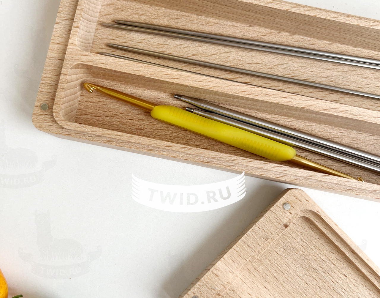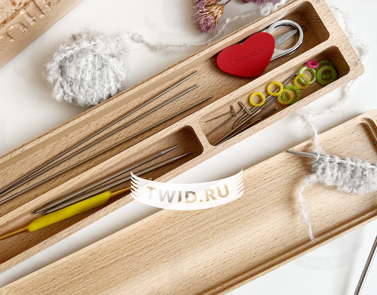 Внутри три секции для хранения прямых спиц (до 30 см), чулочных спиц/крючков и аксессуаров.